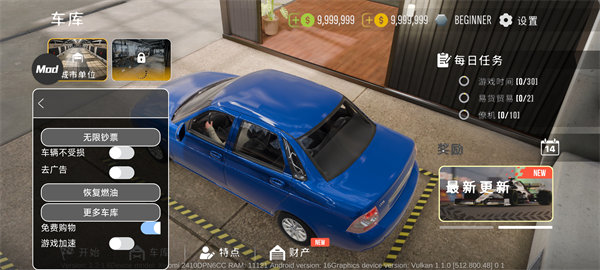 辅助菜单更新:新增游戏加速、扩展车库功能,优化无限绿币与免费购车体验,操作更便捷。