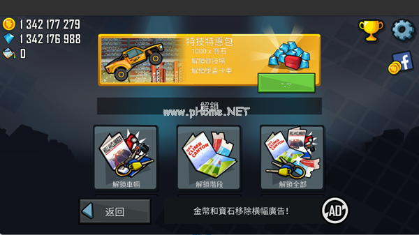 7、在游戏商店中,还可以用金币解锁新载具、升级车辆各类配件,提升车辆整体性能,让你的车库更丰富,轻松应对高难度关卡。