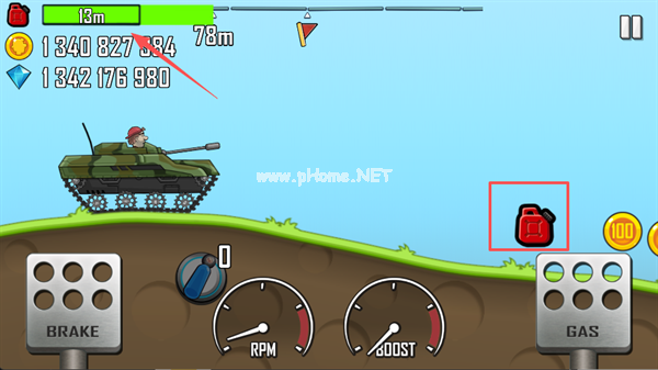 4、游戏中左侧是刹车键,右侧是油门键,合理控制油门与刹车的节奏,保持车辆平衡,避免在起伏路段翻车。
