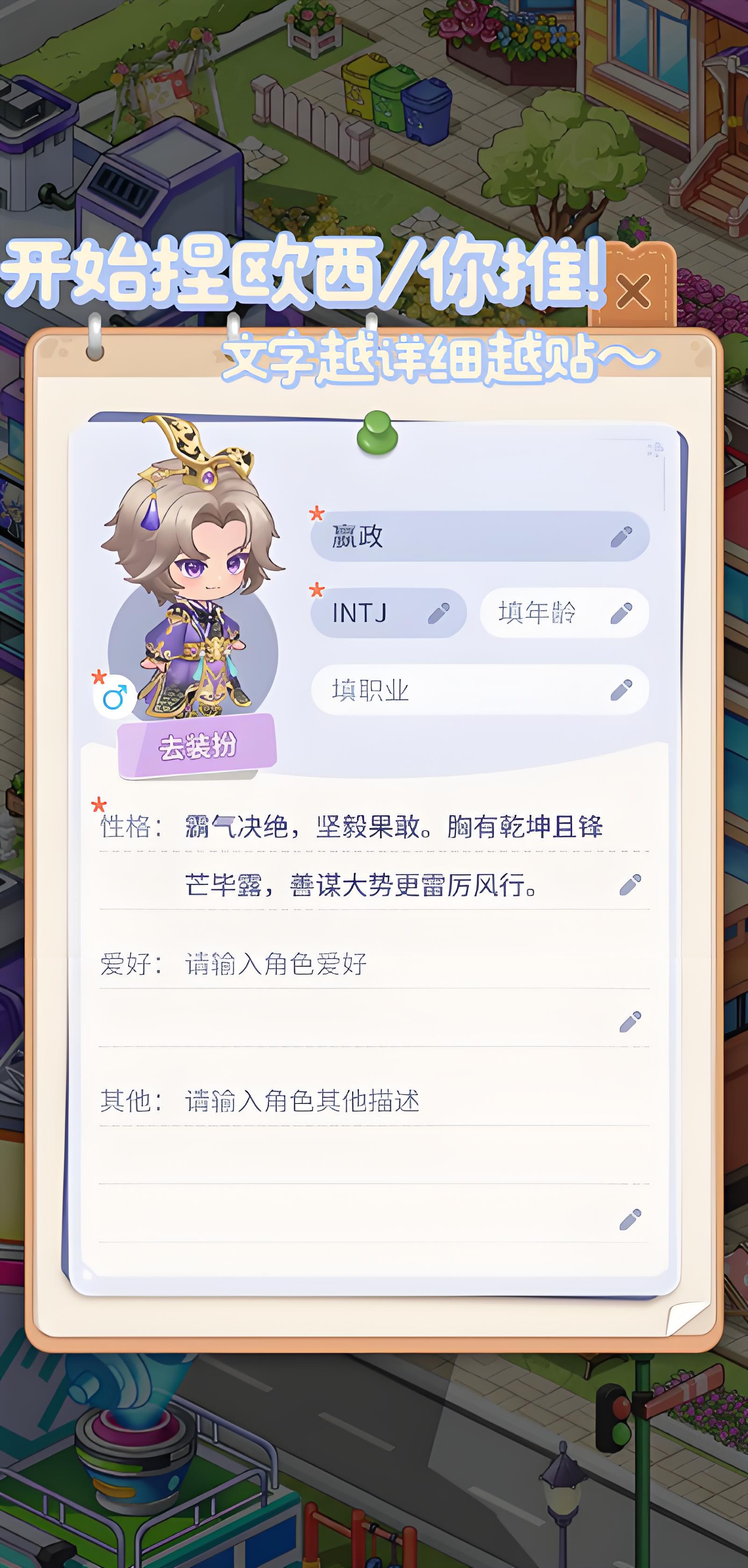 1、OC创建三步走:先搭建角色基础骨架,填写姓名、核心性格等关键信息,无需一次性完善所有内容;再通过捏脸与穿搭打造视觉形象,根据性格搭配风格,活泼的OC可选亮色穿搭,文静的OC可选简约风格;最后补充背景故事与人际关系,让角色更丰满立体。