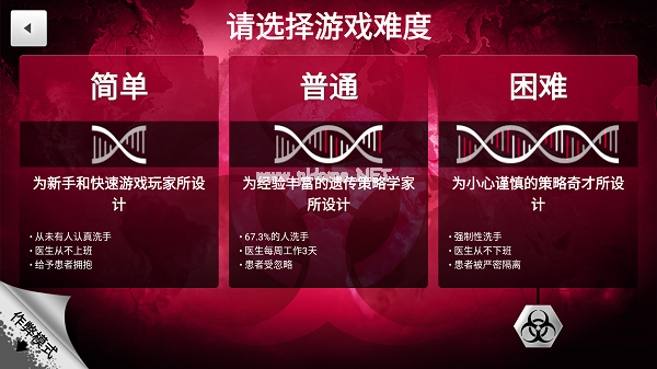 简单(Casual):适合新手与快速游戏玩家,人类普遍不注重卫生、医生不研发解药,病原体传播概率极高;解药模式中各国合作顺畅,解药研发速度快,人民主动佩戴口罩,防疫难度低。